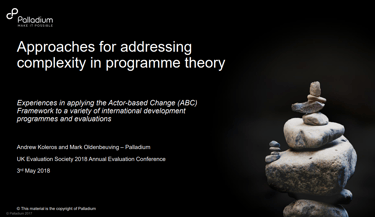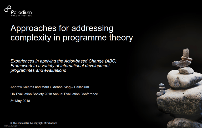 The ABC Framework brochure provides an accessible overview of the ABC Framework. It briefly goes into key concepts from complexity science and behaviour change, before discussing the three key components of developing programme theory using the ABC Framework: an Actor-based Systems Map, a Change Agenda, and Causal Impact Pathways. The brochure discusses implementation experiences in Pakistan and Nepal. The brochure is based on a presentation delivered to the UK Evaluation Society conference in 2018.