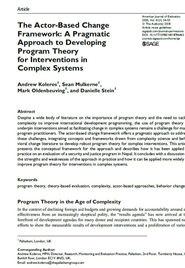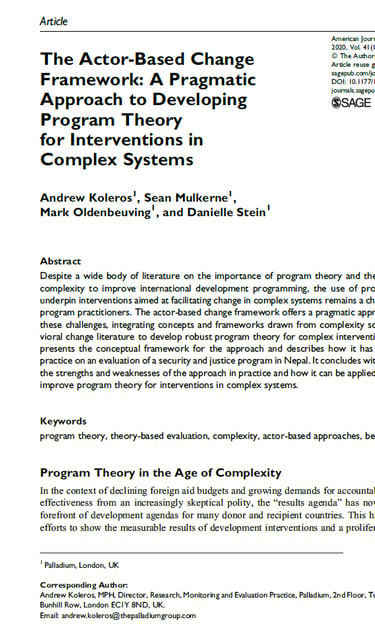 If you are interested in learning more about the theoretical underpinnings of the ABC Framework, you can read the original paper, published in the American Journal of Evaluation in 2020. The paper provides a comprehensive overview of the framework and its theoretical foundation, and is a valuable resource for anyone who wants to learn more about how the framework was developed and how it can be applied in practice. The paper also includes a case study on the application of the approach on an evaluation of a security and justice program in Nepal.